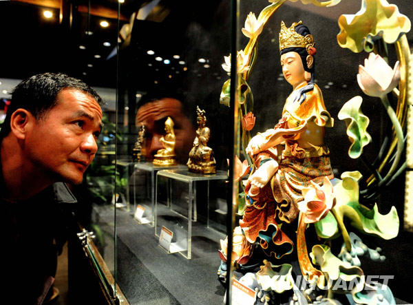 當日,閩臺首屆鎏金銅佛精品展暨名家品鑒活動在福州開幕,60多座鎏金銅佛精品跨越臺灣海峽來到福建,這是臺灣民間文物首次成批量到大陸展出。新華社記者 張國俊 攝