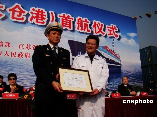 二00八年十二月十五日上午,裝滿集裝箱的“天福”輪一聲長鳴,太倉港至臺灣港航線從此告別繞道日本石垣島的歷史,直接駛向臺灣。首航前,江蘇海事局副局長韋之杰向“天!陛喦咏艽L鄭重頒發了船舶直航臺灣出口許可證。 中新社發 丁梅 攝