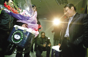 昨天晚上6時(shí)多,俞康和陳怡抱著冷藏箱步出杭州蕭山國(guó)際機(jī)場(chǎng)。