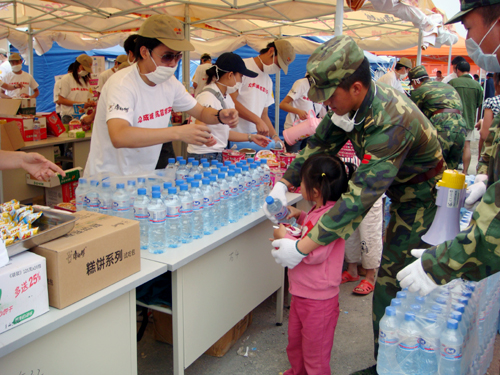 汶川地震期間,頂新集團送去食物、飲用水等救災物資,和災區(qū)人民共度難關(guān)。(頂新集團提供)