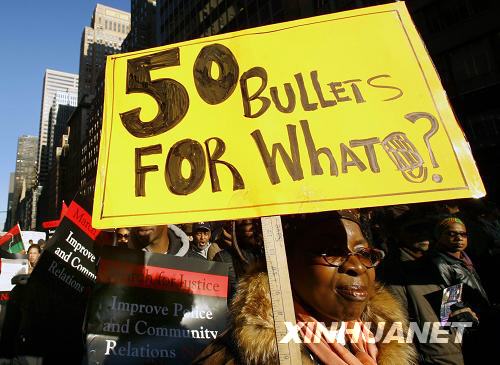 這是2006年12月16日,一名女子手舉抗議標語參加在紐約第五大道舉行的抗議游行,標語牌上寫道:為什么要開50槍?當日,數千名美國民眾聚集在紐約第五大道舉行示威活動,抗議非洲裔美國人肖恩·貝爾上月遭警察無端射殺。在美國,警察濫施暴力,侵犯公民權利。 新華社發