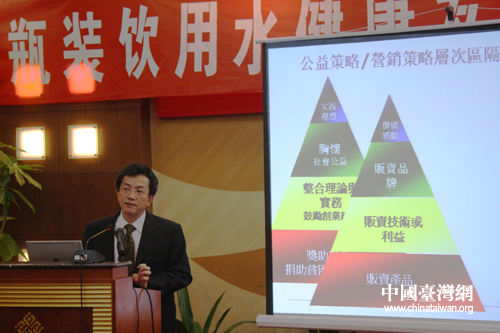 康師傅控股集團總裁室副總經(jīng)理錢為家在“瓶裝飲用水健康發(fā)展戰(zhàn)略研討會”上介紹本公司開展水公益事業(yè)的情況。