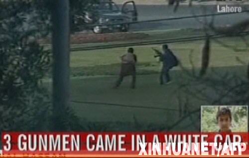 這張3月3日的電視截圖顯示,在巴基斯坦東部旁遮普省首府拉合爾,身份不明的持槍者襲擊一輛載有斯里蘭卡板球隊隊員的汽車,造成10多人死傷。 新華社/法新