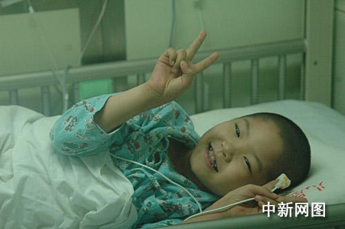 接受臺(tái)灣同胞“捐髓”的劉磊擺出勝利的手勢(shì)。仝世賓 攝
