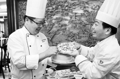圖為臺灣涵碧樓大飯店總廚劉宏峰(左)向上海綠波廊酒樓技術總監陸亞明介紹臺灣名點“紅豆松糕”。葛鳳章攝