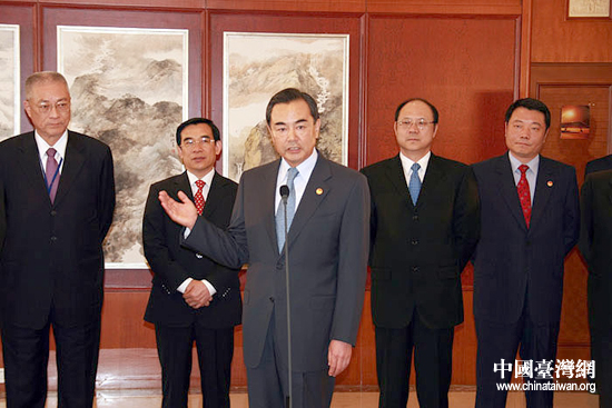 5月25日上午,中共中央臺辦主任王毅在首都機場致辭歡迎中國國民黨主席吳伯雄一行。中國國民黨主席吳伯雄率領(lǐng)中國國民黨大陸訪問團于25日11時許乘機抵達北京,開始訪問大陸行程。中共中央臺辦主任王毅到機場迎接。(中國臺灣網(wǎng) 鐘寶華 攝)