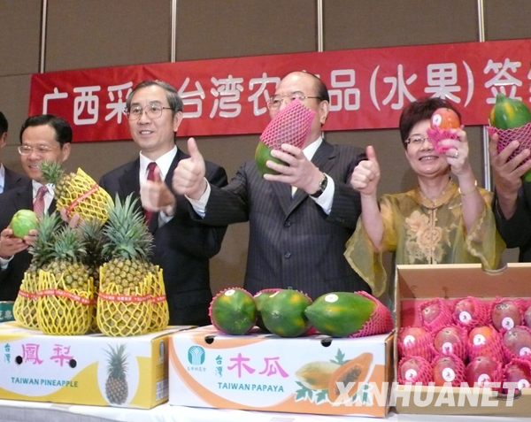5月25日,廣西采購臺灣農產品(水果)簽約儀式在臺南舉行。這次廣西與臺南縣玉井鄉農會簽約購買鳳梨、芭樂和木瓜三個品種,共1.8萬箱、150多噸,采購金額200多萬元人民幣。新華社記者王勉攝