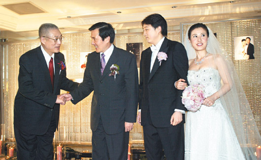 國民黨秘書長吳敦義(左)兒子吳子文(右二)昨天結(jié)婚,馬英九(左二)等黨政要員幾乎全部到齊。