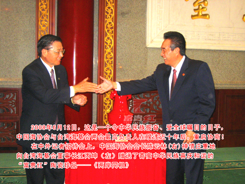 2008年6月12日,臺(tái)灣海峽交流基金會(huì)董事長(zhǎng)江丙坤先生一行回中國(guó)大陸協(xié)商兩岸關(guān)系改善與發(fā)展,中國(guó)海峽會(huì)會(huì)長(zhǎng)陳云林先生贈(zèng)送的禮品為福建省富貴紅文化發(fā)展有限公司藝術(shù)總監(jiān)徐少東先生創(chuàng)作的富貴紅陶瓷藝術(shù)作品《兩岸同根》。相對(duì)于會(huì)談議題,似乎只是輕描淡寫的一次禮品互贈(zèng),但對(duì)于陶瓷業(yè)界來說卻引起了不小的轟動(dòng),引發(fā)了人們對(duì)陶瓷藝術(shù)品《兩岸同根》的關(guān)注。人們不禁會(huì)問:《兩岸同根》何以在這樣的一個(gè)高規(guī)格的、意義非同一般的兩岸對(duì)話中受到如此高的禮遇?其實(shí),我們將余光中的《鄉(xiāng)愁》與徐少東的《兩岸同根》置放在一起進(jìn)行比較的時(shí)候,兩者雖是以不同的語言載體進(jìn)行表現(xiàn)的藝術(shù)作品,但我們?nèi)匀徊浑y發(fā)現(xiàn)其中的緣由。
