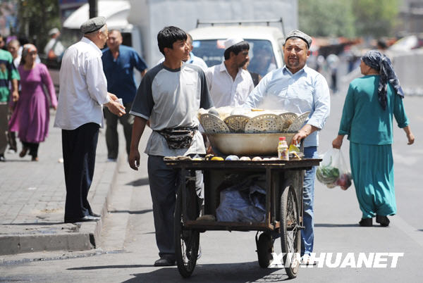 7月9日,在烏魯木齊市二道橋地區(qū)街頭,商販在推車叫賣小吃。新華社記者沙達提攝