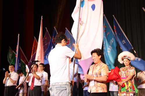 中央統(tǒng)戰(zhàn)部副部長尤蘭田授“龍脈相傳,青春中華”“全國臺聯(lián)2009年臺胞青年千人夏令營”總營旗。(中國臺灣網 芮文輝 攝)
