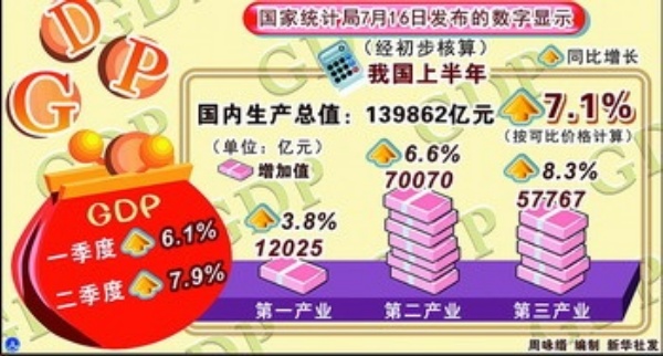 中國(guó)經(jīng)濟(jì)網(wǎng)綜合報(bào)道,國(guó)家統(tǒng)計(jì)局7月16日公布,我國(guó)上半年國(guó)內(nèi)生產(chǎn)總值(GDP)同比增長(zhǎng)7.1%,二季度增長(zhǎng)7.9%,扭轉(zhuǎn)了此前連續(xù)7個(gè)季度的回落態(tài)勢(shì),用數(shù)字證明我國(guó)經(jīng)濟(jì)刺激一攬子計(jì)劃取得了明顯成效,經(jīng)濟(jì)形勢(shì)企穩(wěn)回升,為實(shí)現(xiàn)全年經(jīng)濟(jì)增長(zhǎng)“保8”目標(biāo)奠定了堅(jiān)實(shí)基礎(chǔ)。與此同時(shí),經(jīng)濟(jì)恢復(fù)過(guò)程中出現(xiàn)的新問(wèn)題受到高度關(guān)注,下半年政策走向也成為各方矚目的焦點(diǎn)。