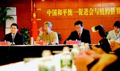 全國人大常委會前副委員長、中國和平統一促進會副會長許嘉璐(圖左二),22日率團在中國駐紐約總領事館與僑界人士座談,他表示臺海兩岸當前的可喜形勢,海外華人社團功不可沒。 (記者曹健攝)