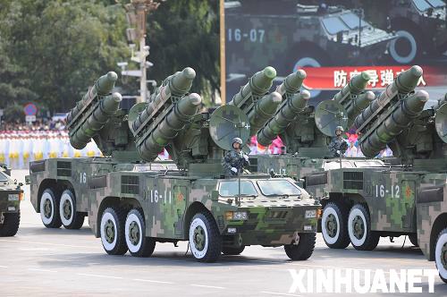 10月1日,首都各界慶祝中華人民共和國成立60周年大會在北京天安門廣場隆重舉行。這是國慶閱兵分列式中的防空導彈方隊正在通過天安門廣場。新華社記者陳曉偉攝