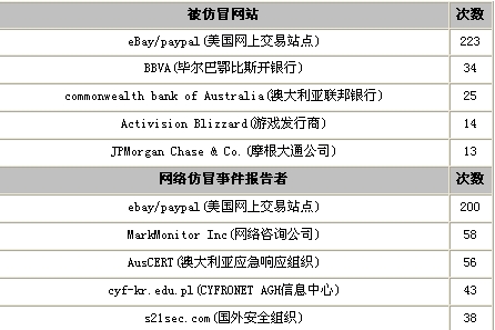圖為向國家互聯網應急中心投訴網絡仿冒事件的國外機構排名前五位以及被仿冒網站的前五名