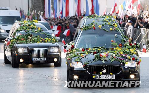 4月18日,在波蘭南部城市克拉科夫,運送已故總統(tǒng)卡欽斯基及其夫人靈柩的汽車駛過大街。卡欽斯基夫婦的葬禮于當(dāng)?shù)貢r間18日下午2時至6時在波蘭南部城市克拉科夫舉行。新華社/法新
