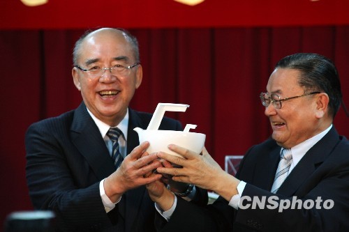10月14日,中國國民黨主席吳伯雄主持任內(nèi)最后一次中常會(huì)后,出席國民黨中央等舉辦的歡送茶會(huì),接受由國民黨秘書長詹春柏代表新主席當(dāng)選人馬英九致贈(zèng)的瓷茶壺“海量”,感謝他的包容與大量。10月17日,國民黨第18屆全黨代表大會(huì)將在臺北縣召開,新舊主席將進(jìn)行交接。 中新社發(fā) 黃少華 攝