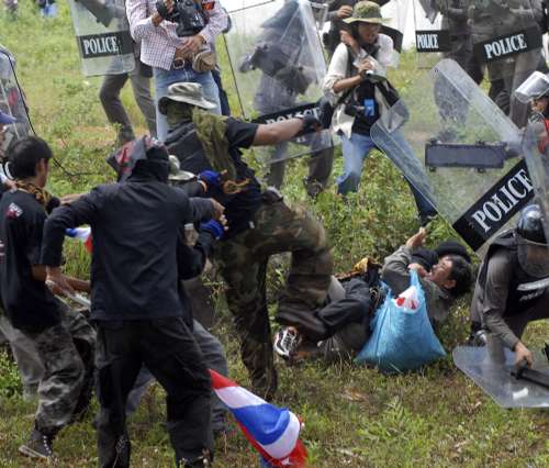 由于當(dāng)?shù)鼐用癫粷M黃衫軍在當(dāng)?shù)厥就,村民?dān)心會(huì)影響國(guó)家聲譽(yù)和柬埔寨的關(guān)系,因此村民在通往柏威夏寺的路上搭起路障,防暴警察也全副武裝,防止示威者通過(guò)。電視片段所見(jiàn),黃衫軍多次揮動(dòng)長(zhǎng)棒,與防暴警察和試圖阻止他們進(jìn)入柏威夏寺一帶的村民發(fā)生沖突(見(jiàn)圖)。省政府官員表示有數(shù)十人在騷亂中受傷,其中二十人要送院治理,一名送院者頸部受到槍擊。事件最后在警方調(diào)解下解決。