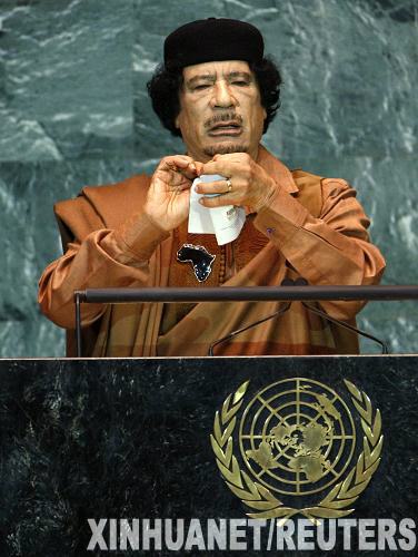 9月23日,利比亞領導人穆阿邁爾·卡扎菲在聯(lián)合國大會一般性辯論上發(fā)言時,佯裝要撕毀《聯(lián)合國憲章》。卡扎菲23日在第64屆聯(lián)大一般性辯論中發(fā)言說,必須在國際政治中實行民主,對聯(lián)合國及安理會實行改革,真正實現(xiàn)各國在聯(lián)合國的平等地位。這是卡扎菲執(zhí)政40年來首次來到紐約聯(lián)合國總部并在聯(lián)大一般性辯論中發(fā)言。新華社/路透