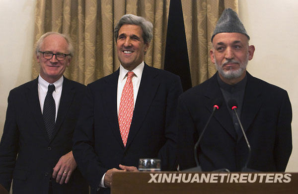 10月20日,在阿富汗首都喀布爾,阿富汗總統卡爾扎伊(右)、美國參議院外交委員會主席約翰·克里(中)和聯合國駐阿富汗特別代表卡伊·艾德共同出席新聞發布會?栐20日說,他接受獨立選舉委員會關于總統選舉的最終裁決,即沒有候選人首輪得票率超過50%,第二輪投票將于11月7日舉行。新華社/路透