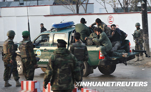 10月28日,在阿富汗首都喀布爾,傷者在警方的護送下被緊急送往醫院。阿富汗內政部一名官員28日說,當天在喀布爾聯合國援助團招待所內發生的槍戰已告結束,3名塔利班武裝分子被擊斃,6名聯合國工作人員喪生。新華社/法新