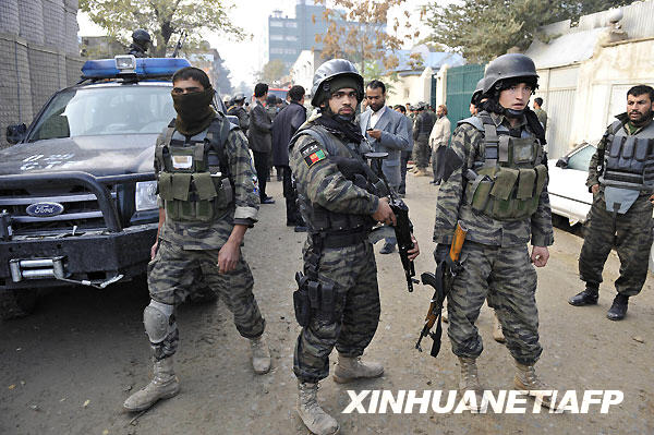 10月28日,警方在阿富汗首都喀布爾市中心聯合國一家招待所外警戒。阿富汗內政部一名官員28日說,當天在喀布爾聯合國援助團招待所內發生的槍戰已告結束,3名塔利班武裝分子被擊斃,6名聯合國工作人員喪生。新華社/法新