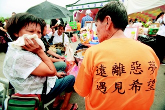 高雄縣甲仙鄉小林村罹難者二七法會,家屬T恤上“遠離惡夢、遇見希望”是深切心聲。圖片來源:臺灣《聯合報》