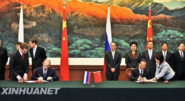 10月13日,國(guó)務(wù)院總理溫家寶與俄羅斯總理普京在北京人民大會(huì)堂簽署《中俄總理第十四次定期會(huì)晤聯(lián)合公報(bào)》。新華社記者謝環(huán)馳攝