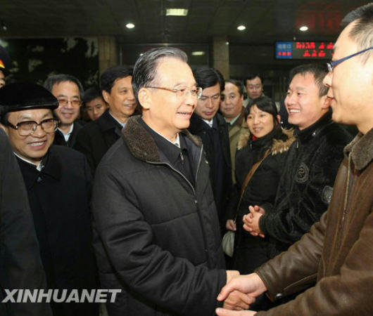 11月12日,中共中央政治局常委、國(guó)務(wù)院總理溫家寶趕赴河北暴雪地區(qū)指導(dǎo)工作。圖為抵達(dá)石家莊后,溫家寶前往火車站候車室看望旅客。新華社記者劉衛(wèi)兵攝