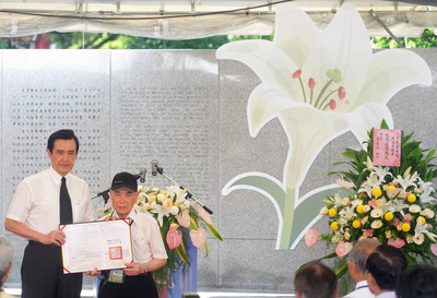 馬英九(左)15日前往臺北市介壽公園“白色恐怖政治受難者紀念碑”,出席“2013年戒嚴時期政治受難者紀念追思儀式”,頒發回復名譽證書給受難者和家屬。圖片來源:臺灣“中央廣播電臺”