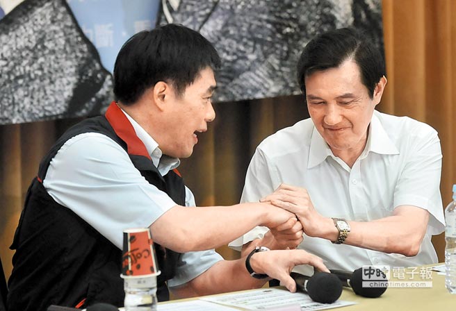 馬英九為連任國民黨主席全力沖刺,懇托會上臺北市長郝龍斌致完詞后。圖片來源:臺灣《中國時報》