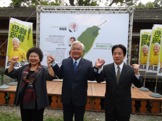 高雄市長陳菊(左)、臺南市長賴清德(右)今天下午同臺為參加民進黨云林縣長初選民調李進勇(中)站臺。(圖片來自臺媒)
