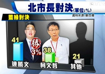 新北方面,有臺媒在22日公布1份民調,在1215份有效樣本中,有50%的民眾支持現任市長朱立倫、有30.94%的人支持游錫堃,另有19.06%的民眾沒意見;《聯合報》今天也公布新北市民調,朱立倫再度以超過5成的支持度,強壓來勢洶洶的挑戰者游錫堃。