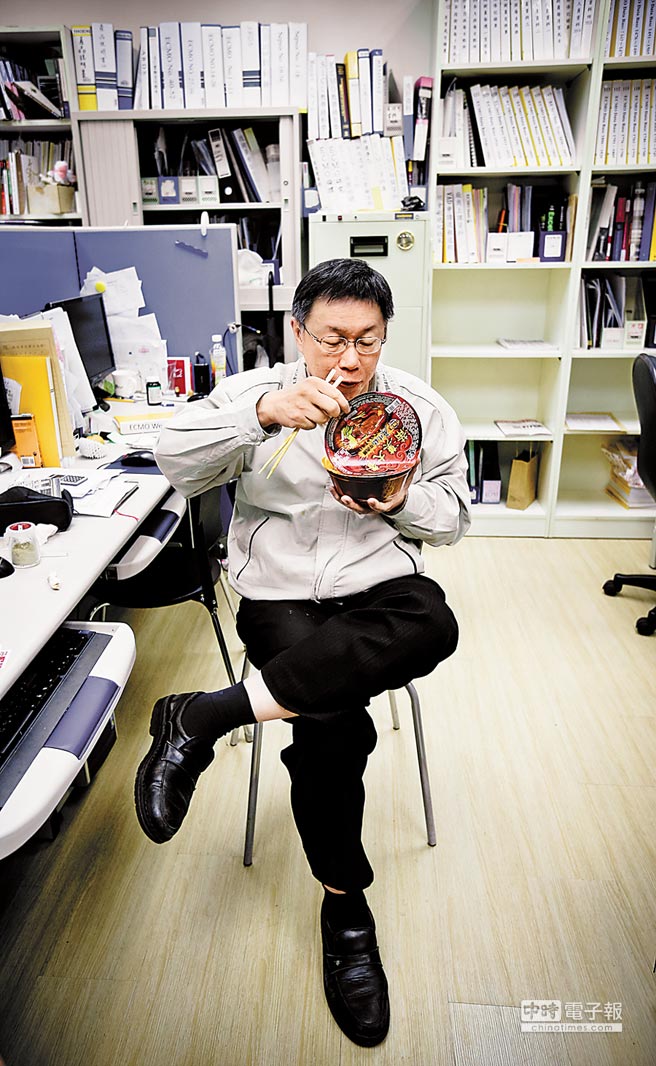 接受專訪的這天深夜,柯文哲匆匆走進(jìn)臺(tái)大醫(yī)院“葉克膜小組”辦公室,隨手抓了碗泡面當(dāng)晚餐,隨興的他翹著二郎腿“狼吞虎咽”,展現(xiàn)有別于一般政治人物的性格。(圖片來源:臺(tái)灣中時(shí)電子報(bào))