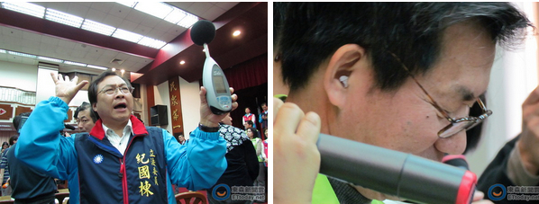 日前審查服貿(mào)過(guò)程中,民進(jìn)黨播放高分貝音樂(lè),藍(lán)營(yíng)“立委”紀(jì)國(guó)棟(左)拿出分貝器,連綠營(yíng)“立委”李應(yīng)元(右)也受不了戴上耳塞。(臺(tái)媒圖)