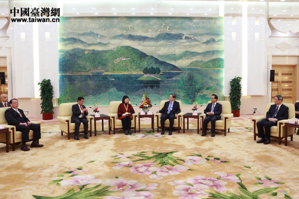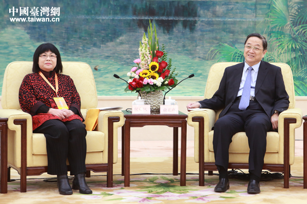 16日上午,俞正聲在北京人民大會堂會見了出席“2014海峽兩岸工會論壇”的臺灣工會界代表。圖左為海峽兩岸勞工發展交流協會理事長侯彩鳳 。(中國臺灣網 于斯文 攝)