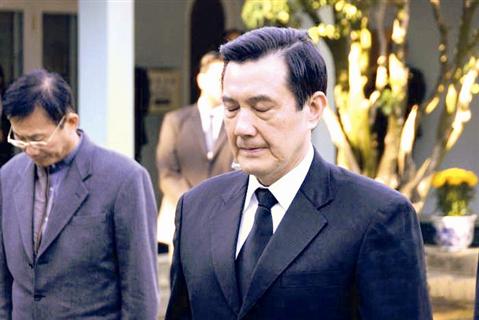 結束追思默哀后,馬英九轉身,可以看到身心極度憔悴,但知道有媒體閃光燈聚焦在他身上,又不得不努力讓嘴角上揚,勉強自己讓外界看到堅強一面。