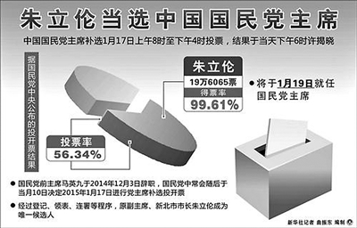 2014年11月底,國民黨在臺灣地區“九合一”選舉中慘敗,馬英九隨即辭去黨主席。之后,53歲的朱立倫成為黨主席補選唯一候選人。