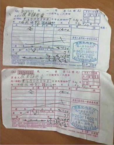 “課綱微調的真相”臉書粉絲團日前公布來自反黑箱課綱北區社團的照片,內容是2張購買“傘”的收據打著民進黨統編,換言之可向民進黨請款。(臉書圖)