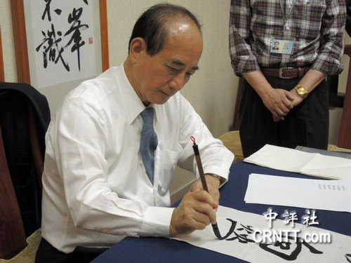 9日上午,王金平利用空閑時間揮毫寫下“欣欣向榮”四個字,當做明年春聯題字。(圖自中評社)