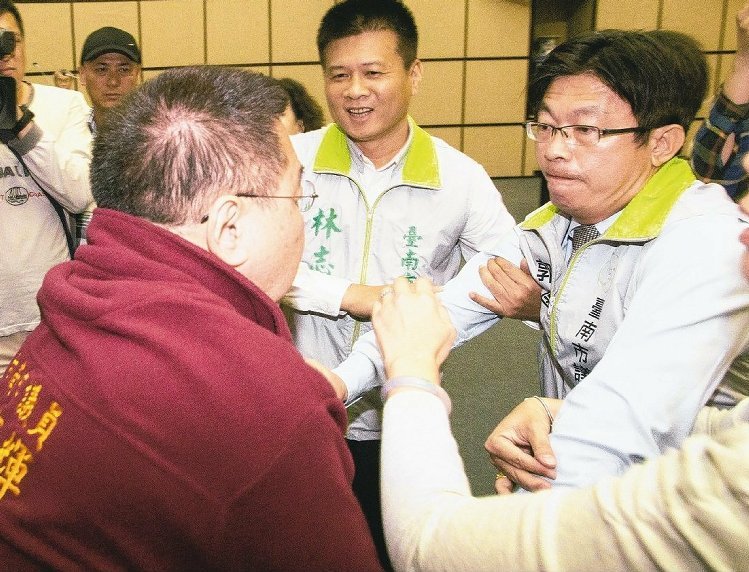 臺南市議會藍綠議員,在議事廳爆發激烈推擠。左為國民黨議員蔡育輝,右為民進黨議員郭國文。