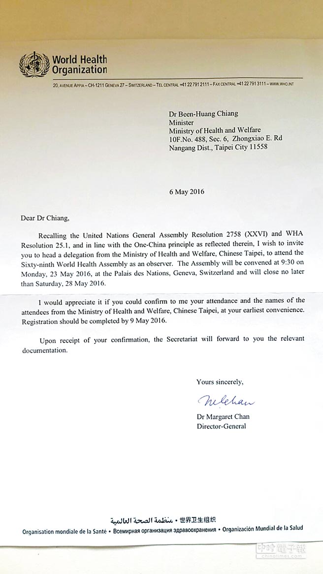 世界衛生組織總干事陳馮富珍5月6日致函臺灣當局“衛生福利部長”蔣丙煌,邀請臺灣以中華臺北(Chinese Taipei)、觀察員的身份,參加第69屆世界衛生大會。邀請函中特別說明,這是依照聯合國大會2758號決議和世界衛生大會25.1號決議中所反映的“一個中國原則”。
