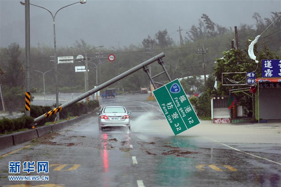9月14日,在屏東到墾丁的公路上,路牌被大風吹倒。當日,超強臺風“莫蘭蒂”掠過臺灣南部地區,最大陣風達16級,造成多地停電,給當地居民的生活帶來嚴重影響。(新華社 發)