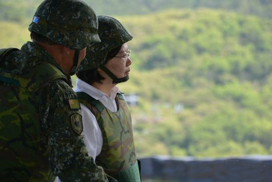 蔡英文此前頭戴鋼盔視察三軍。(臺媒圖)