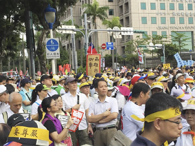 臺灣監(jiān)督年金改革行動聯(lián)盟10月16日前往“立法院”,舉行“程序不正義,何來共識?堅決反對民進(jìn)黨所提出之65歲延退方案”記者會,要求當(dāng)局領(lǐng)導(dǎo)人蔡英文考慮“年金改革委員會執(zhí)行長”林萬億是否適任,避免影響年金改革。早在9月3日,臺灣逾10萬名軍公教(軍人、公務(wù)人員、教師)數(shù)十年來首次走上街頭,抗議在退休年金改革中被民進(jìn)黨當(dāng)局抹黑。