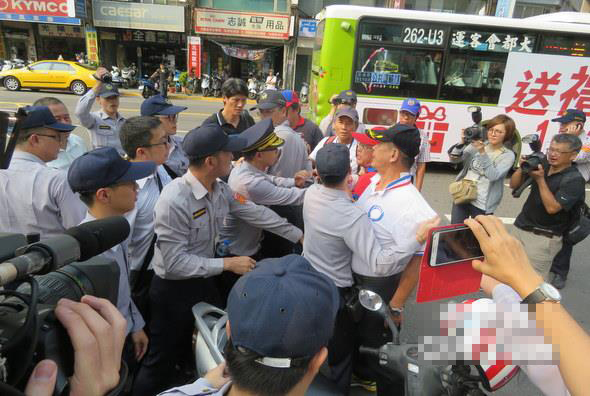 雙方在現(xiàn)場一陣?yán)叮ハ鄦苈暎皭蹏臅?huì)”人士趁機(jī)奪下“臺(tái)聯(lián)黨”的抗議牌子撕爛,高喊“只有中國,沒有兩邊”、“回去找你們李登輝”。隨后警方強(qiáng)行介入隔開雙方,還要求“一人一邊、各自表述”,不要有違法的言行。