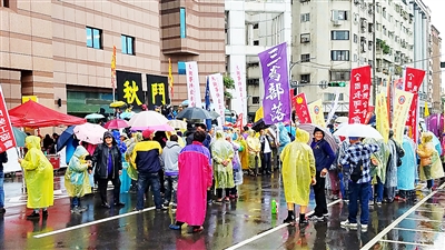 雖然陰雨不斷,現(xiàn)場仍有上百人身著雨衣長時間集結(jié)。集會團體紛紛表示,要“戳破”執(zhí)政黨的謊言騙術(shù),用行動表達民眾對“經(jīng)濟要民主”及“階級要平等”的要求。“秋斗”行動指揮方稱,民進黨當(dāng)局才上任半年,在“全面執(zhí)政”的優(yōu)勢下,非但沒有檢討此前遺留的各種政策性問題,反而在幾個有機會翻轉(zhuǎn)結(jié)構(gòu)的重大政策上退守,甚至復(fù)制并強推各種向資本傾斜、短線操作、只為選舉考慮的法案。