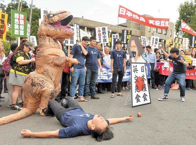 11月18日,國民黨號召各縣市議員至蔡當局“行政院”抗議日本核災食品輸臺,演出行動劇諷刺蔡英文一意孤行。(臺媒圖)