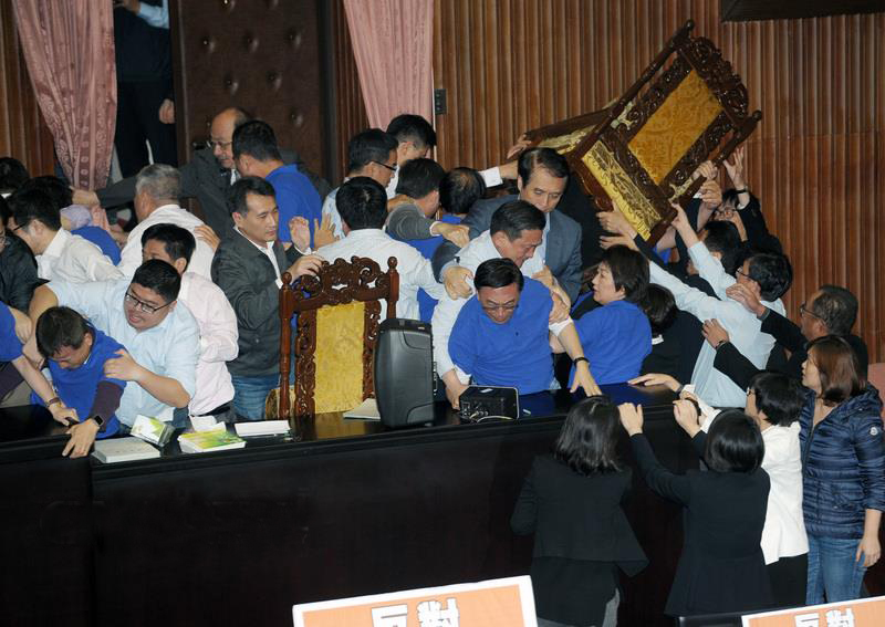 為阻擋民進黨讓“法案”強行過關,中國國民黨“立法院”黨團6日拂曉便占據議場主席臺癱瘓議事。據臺媒報道,民進黨“立法院”黨團下午進場后,見國民黨仍占據主席臺,便先在臺下聚集成小圈圈討論“戰術”,而后瞅準時機一涌而上,幾波“攻勢”后終于倚仗人數優勢,將“藍委”擠下臺。過程中兩黨全面爆發激烈肢體沖突,多人受傷,隨后被送往醫院。