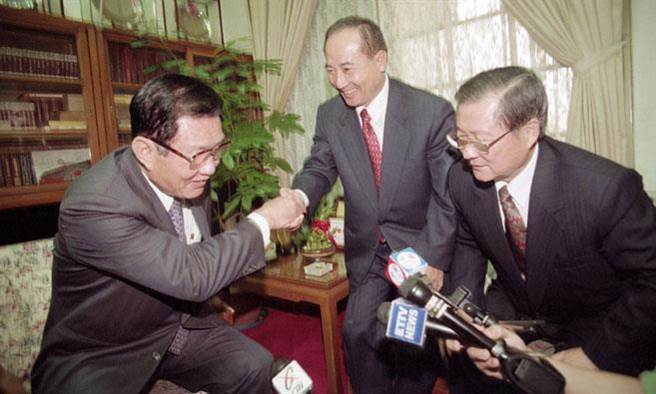 圖為1999年國民黨下屆“立法院正、副院長”提名人王金平(中)、饒穎奇(右),拜訪時任“立法院長”劉松藩(左)。(臺灣“中時”報系資料圖)